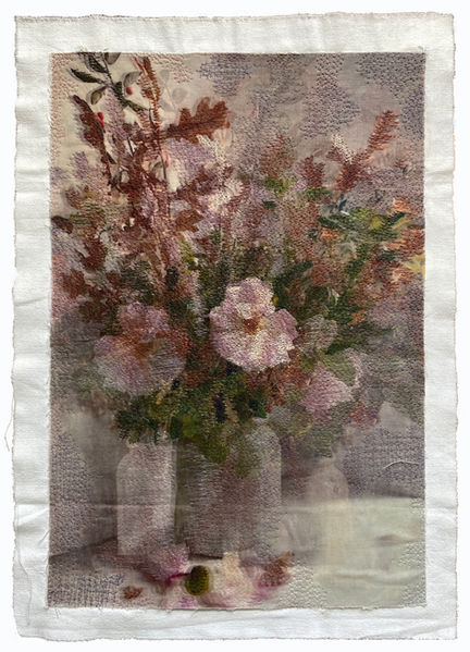 She stitches over figures, cut flowers, and domesticated spaces to evoke symbols of power, loss, memory, and struggles. Mirroring and shadows are also often repeated to show self-awareness and internal worlds. Drawing on the intimacy associated with stained and mended secondhand bedsheets and the machine embroidery connected with craft, her artwork references the domestic while also deliberately distancing itself from traditional fiber arts.