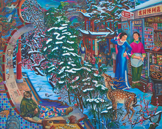 He describes these magazine models as actresses that he can situate into rooms like a stage director. His lines are so precise that it seems like he might be working with live models. All the details of the visual elements he selects to create his images are depicted with incredible care, all the way down to a tiny packet of cigarettes in a corner of the scene showing an existing brand name. He uses the technique of parallel perspective, meaning that the objects he uses in the background are simply smaller. This makes the details of the background more precisely visible than in real life: which is what gives the overall impression of a superimposition of flat decor, of a two-dimensional scenography. Mixing visual elements of Western and Chinese pop culture, the scenes feel strangely familiar while also offering a mysterious narrative.