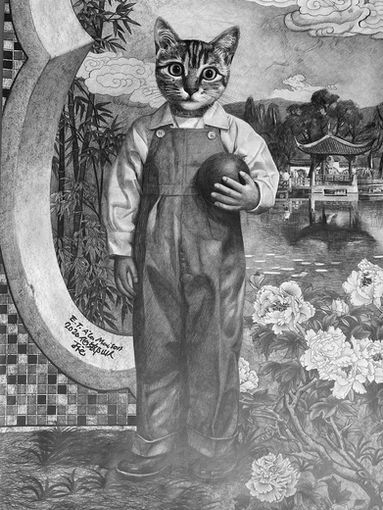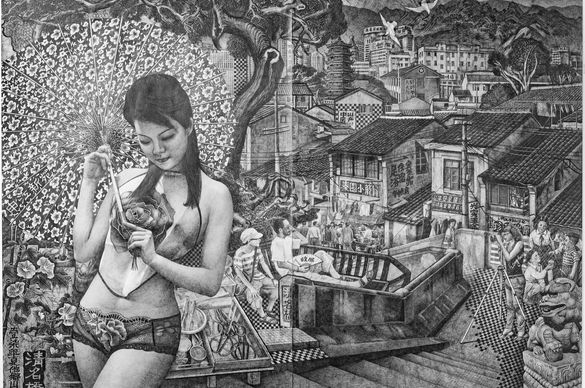 For Art Carouge and the Genève Art Weekend, Le Salon Vert will host an exhibition by Jie Qiu, a Chinese artist who lives and works in Geneva. Jie Qiu will present a large oil painting, a series of colored-pencil posters and his graphite drawings, as well as several Chinese paintings.Jie Qiu became internationally known for his lavish large format graphite drawings. Today he recycles the scenographies of some of his drawings into large oil paintings. One of these paintings, “La Grande Neige” will be viewable at Le Salon Vert, stretching across an entire wall. This perspective draws the viewer into the painting, as certain details are depicted at full size. The opposite wall will present an arrangement of pieces inspired by Chinese “Dazibao”, the “large-character propaganda” posters used to express public opinion. Handwritten by private citizens, they addressed political and ethical ideas and were hung up in the streets to be read by the general public. Jie Qiu repurposes this type of poster, whose standard format was 60 x 80 cm, for his colored-pencil drawings, using figures and large-character slogans. These pieces are meant to be hung together, like on message boards, in all possible combinations. Finally, Le Salon Vert will present several drawings as well as a few of the artist’s Chinese still-life paintings of flowers, created using traditional procedures.